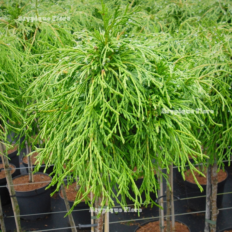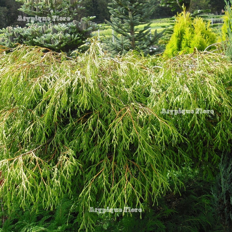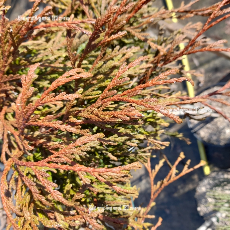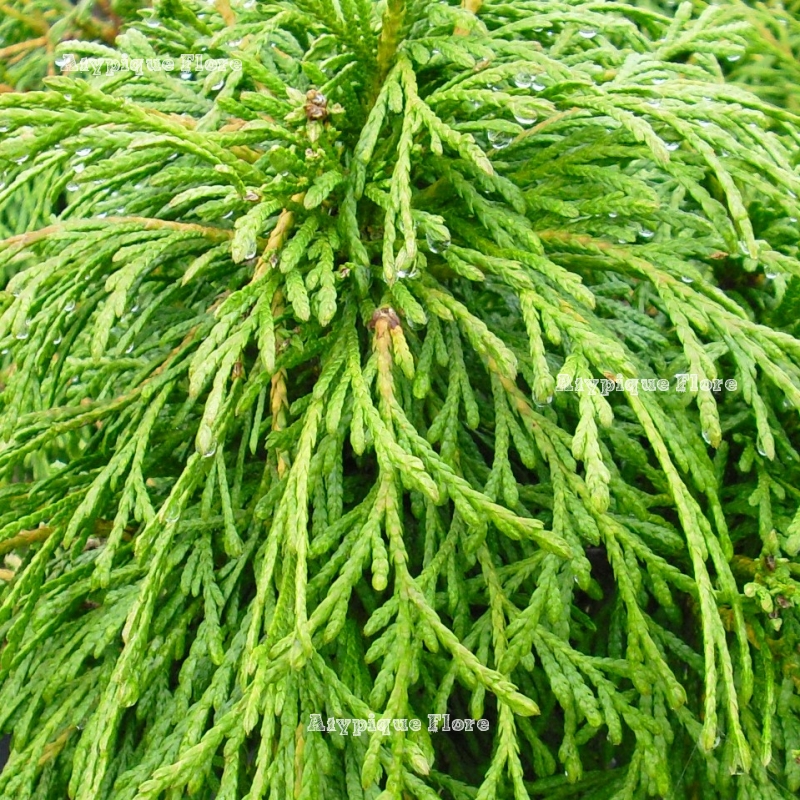 nain au feuillage fin et retombant très original. Il est de couleur vert foncé prenant une belle teinte bronze en hiver.