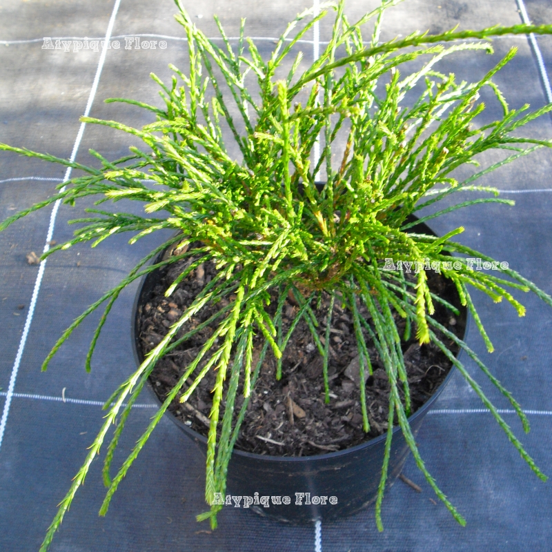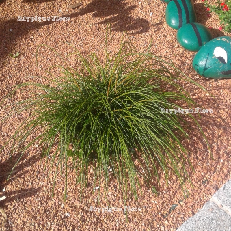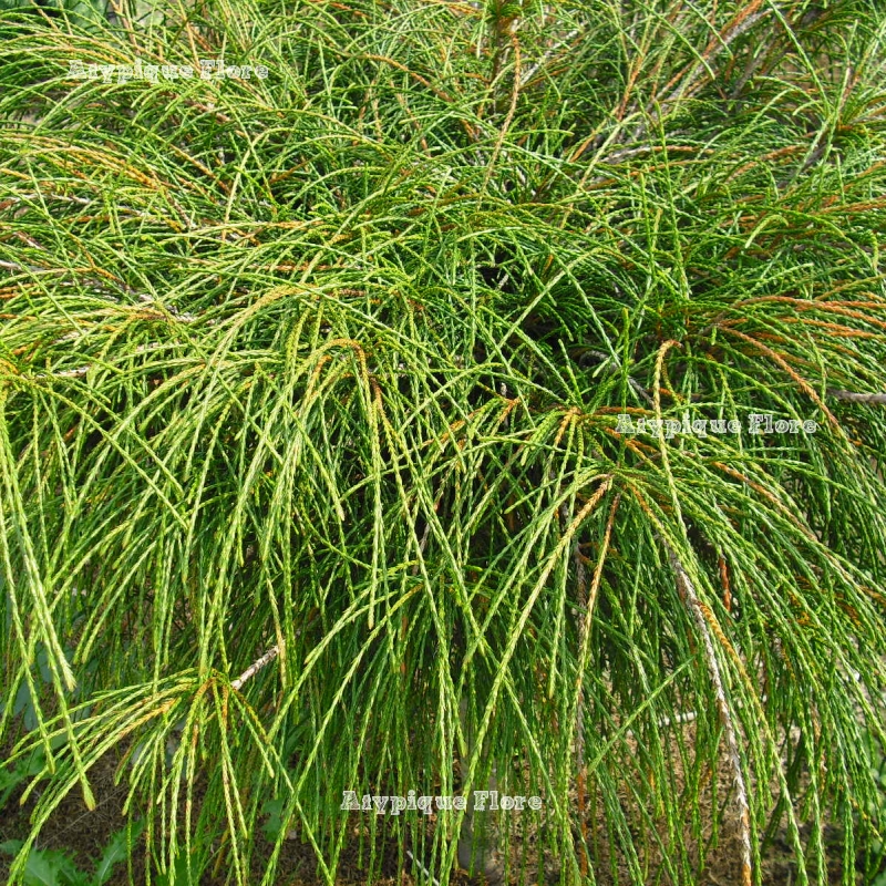 'Whipcord ' est un Thuya nain au feuillage filiforme retombant, très original. Il est de couleur vert foncé toute l'année.